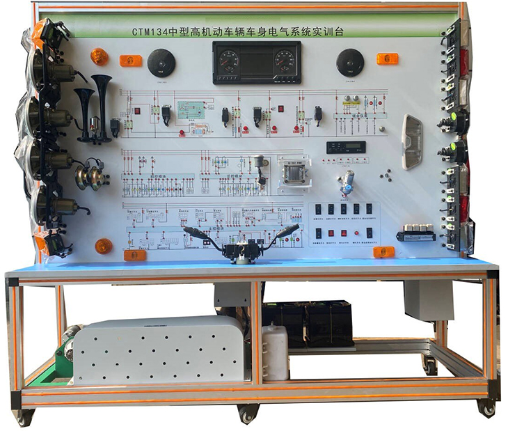 中型高機動車輛車身電氣系統(tǒng)實訓臺、整車電氣實訓臺采用新品實物整車電氣和電控系統(tǒng)等零部件為基礎組成,其中包括組合儀表及其電路、前后控模塊及其電路、主控模塊及其電路、網(wǎng)關及其電路、開關、執(zhí)行器、燈光、其他電氣零部件等。