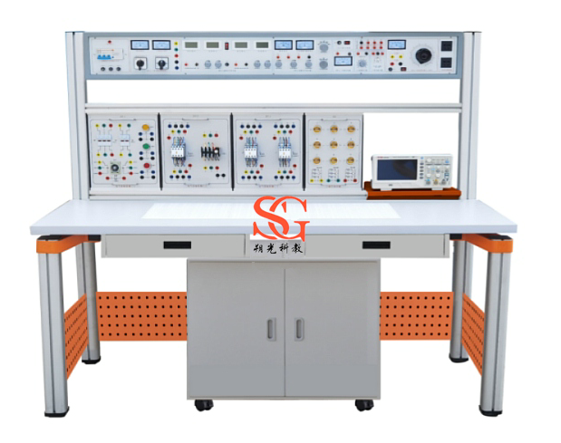 裝置由主機箱、實驗桌、實訓屏、實訓掛箱、移動矮柜、示波器架、學生凳等組成。實訓裝置支架與實訓桌可組合、可拆裝。支架與桌腳一體,鋁合金結構,實訓掛箱、各實驗模塊可根據(jù)實驗需求自由組合放置。