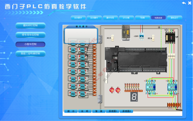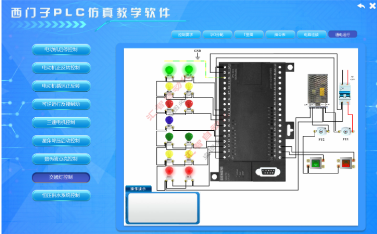 (4)I/O分配:軟件中有I/O分配地址和電路圖,將鼠標點到分配地址資源后會有相應的事物圖片展示,用來讓學生更好的了解器件模型與電路圖。
