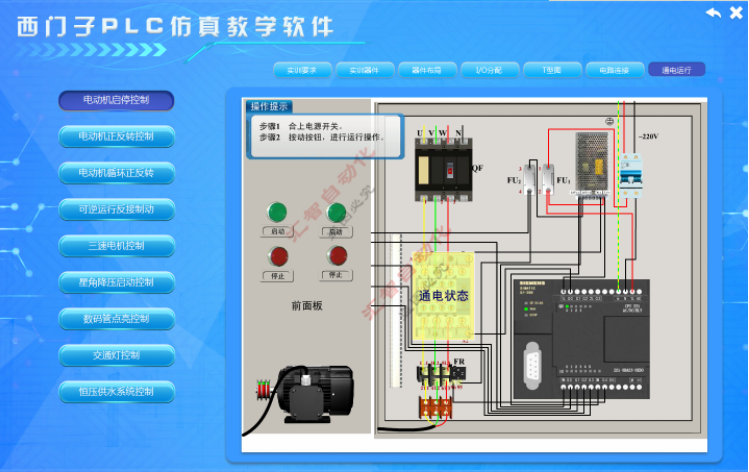 (7)通電運行:以仿真實訓方式實現(xiàn)。通電后,可按照操作步驟按下相應開關,即可直觀地觀察到電路的運行情況,同時配合模擬真實場景的聲效,達到仿真的效果。