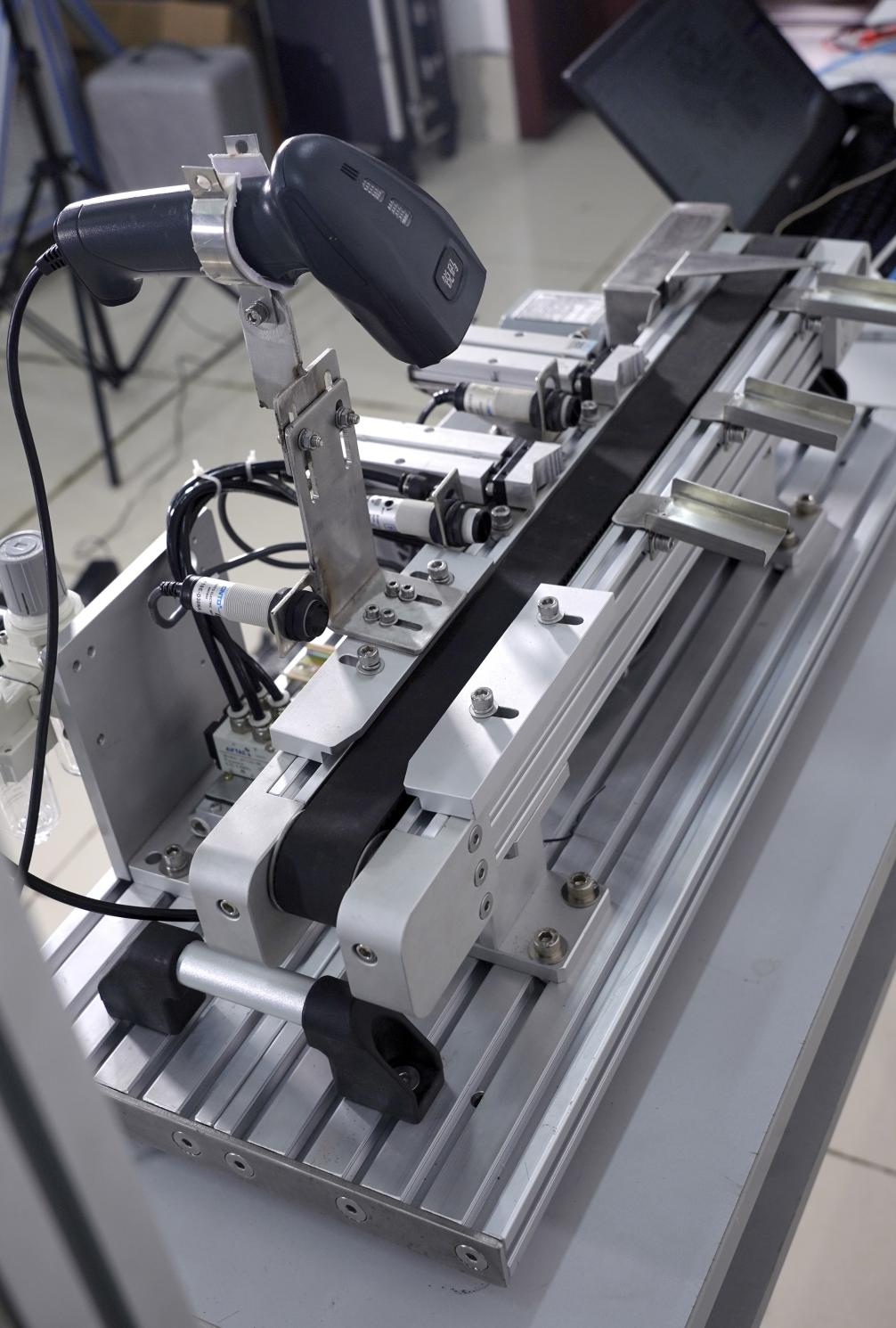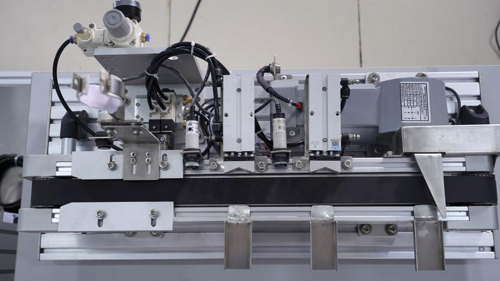 23、結構:模型底板由8mm厚鋁板加工氧化而成,裝有四個黑色鑄鋁拉手,方便搬運。底板上方有環(huán)形輸送帶、氣動機械手、搬運龍門架、分揀機構、變頻電機、伺服電機、步進電機、多種傳感器及氣缸等組成。
