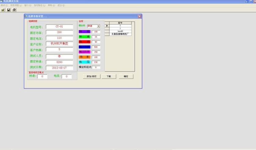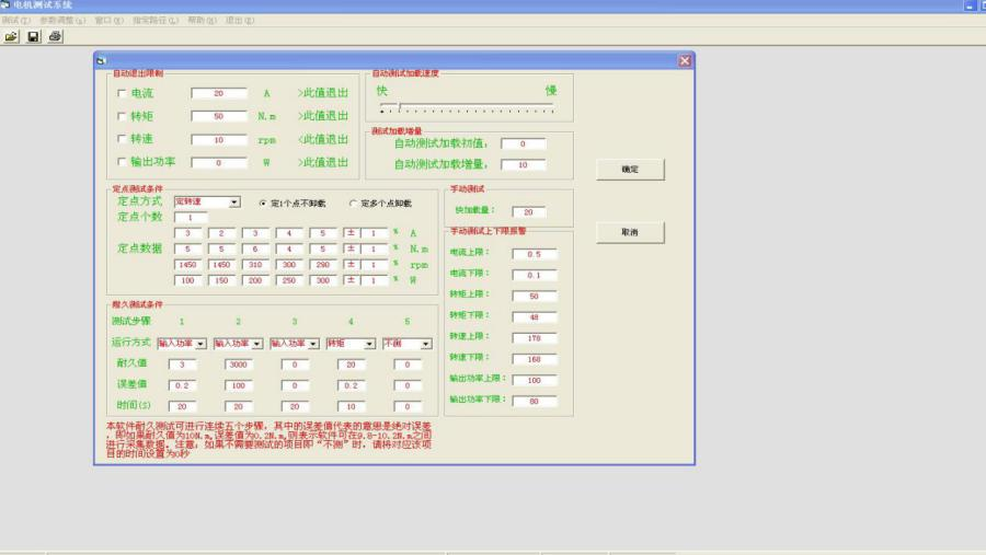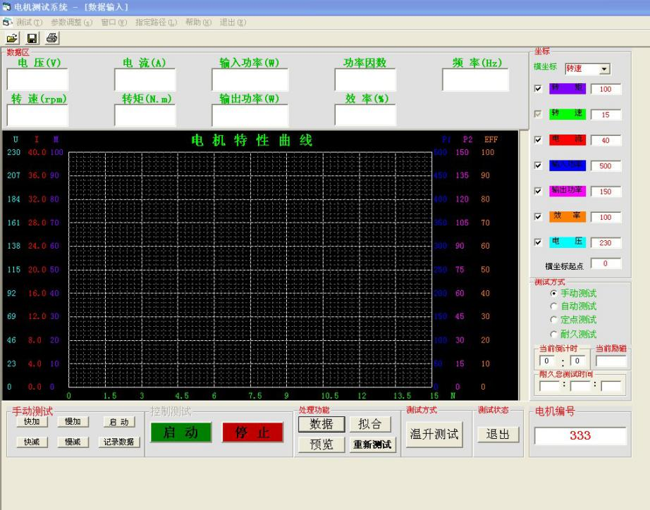 10. 測(cè)試結(jié)果:電機(jī)測(cè)試數(shù)據(jù)以報(bào)表或曲線方式顯示或打印,可保存及下次打開查看;顯示曲線時(shí),可以修改曲線坐標(biāo)參數(shù)及橫坐標(biāo)、縱坐標(biāo)的選擇;測(cè)功機(jī)負(fù)載通過手動(dòng)和自動(dòng)可以任意調(diào)節(jié).完成空載到堵轉(zhuǎn)的測(cè)試.實(shí)時(shí)記錄采集當(dāng)前數(shù)據(jù).輸入功率、電流、電壓、轉(zhuǎn)矩、轉(zhuǎn)速、效率、輸出功率。