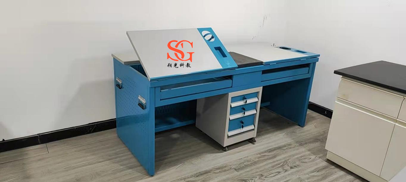 左、右桌面為角度可調手工繪圖板(傾角角度的底部采用U字形槽的轉軸結構,采用新的鉸鏈);手工繪圖板右邊安裝有筆凹槽的功能板(可以同步傾角、固定結實不松動),繪圖板靠身邊采用鋼板三邊折板包裹繪圖板,保證結實可靠;二工位中間放置大理石平板尺寸不低于300×400×25mm,用于零部件測量平臺。