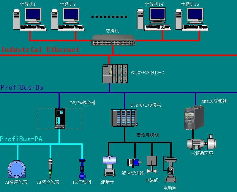 是一套基于現場總線控制的實驗設備,它是集自動化儀表技術,計算機技術,通訊技術,自動控制技術為一體的多功能實驗裝置。系統(tǒng)包括流量、溫度、液位等熱工參數,可實現系統(tǒng)參數測定、單回路控制、串級控制、前饋控制、比值控制等多種控制形式?刂葡到y(tǒng)采用西門子的分布式I/O單元ET200M,監(jiān)控軟件采用SIMATICWINCC。采用現場總線的液位變送器、壓力變送器、渦輪流量計、變頻器、電動調節(jié)閥、溫度變送器以及分布式I/O模塊。該實驗裝置既可作為本科、?啤⒏呗氝^程控制課程的實驗裝置,也可作為研究生及科研人員在復雜控制系統(tǒng)、先進控制系統(tǒng)研究方面提供物理模擬對象和實現手段。同時也可以作為學習現場總線過程控制的一個實驗手段。