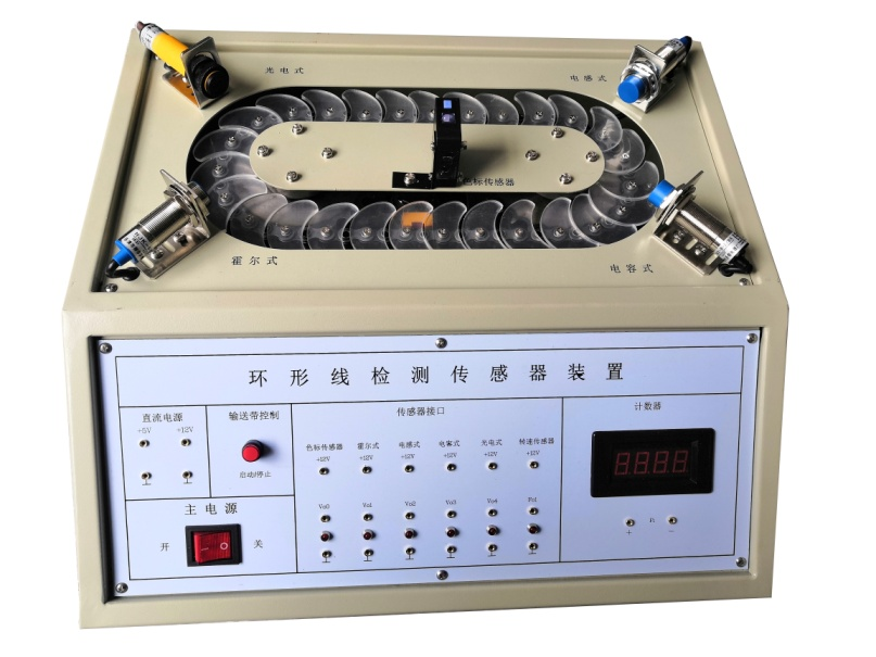 環(huán)形生產(chǎn)線模型通過調(diào)速電機改變環(huán)形生產(chǎn)線運行速度,可對工件進行在線動態(tài)檢測,通過工件計數(shù)器顯示面板顯示。采用7種常用生產(chǎn)線傳感器。