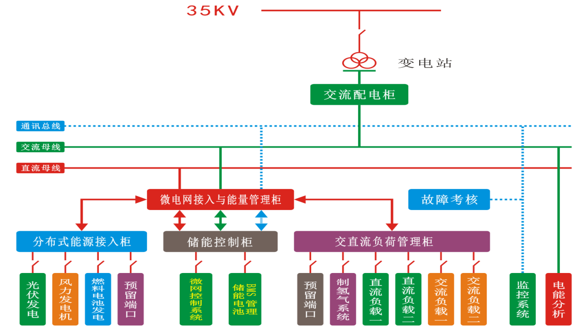 該系統(tǒng)采用交流+直流雙母線結(jié)構(gòu),集成能量控制系統(tǒng)(PCS)、電池管理系統(tǒng)(BMS)、分布式發(fā)電系統(tǒng)(DG)、交直流負(fù)荷、能量管理系統(tǒng)(EMS)與監(jiān)控系統(tǒng)(SCADA)等,實(shí)現(xiàn)清潔低碳、安全高效的源-網(wǎng)-荷-儲(chǔ)協(xié)同優(yōu)化功能。應(yīng)用數(shù)字化、信息化與智能化能量管理系統(tǒng)控制,通過源源互補(bǔ)、源網(wǎng)協(xié)調(diào)、網(wǎng)荷互動(dòng)、網(wǎng)儲(chǔ)互動(dòng)和源荷互動(dòng)等多種交互形式,可以更經(jīng)濟(jì)、高效和安全地利用分布式新能源與儲(chǔ)能,實(shí)現(xiàn)電能削峰填谷、負(fù)荷不間斷優(yōu)質(zhì)供電、系統(tǒng)智能化保護(hù)與運(yùn)行、自由離并網(wǎng)無縫切換等,從而實(shí)現(xiàn)發(fā)、用電效益最大化。
