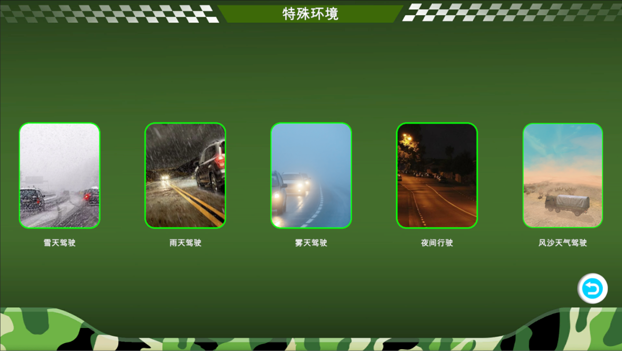 7.特殊天候條件駕駛模擬練習(xí),主要包括夜間、雨天、霧天、雪天、風(fēng)沙天等5種天候。