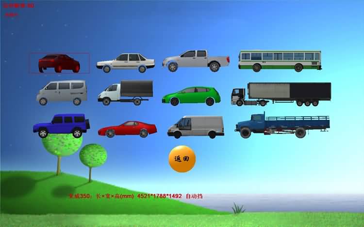 車型選擇界面、模擬車型:各型小車、皮卡、大貨車、大客車、農(nóng)用車、無級(jí)變速車等,用戶可根據(jù)需要任意選擇。