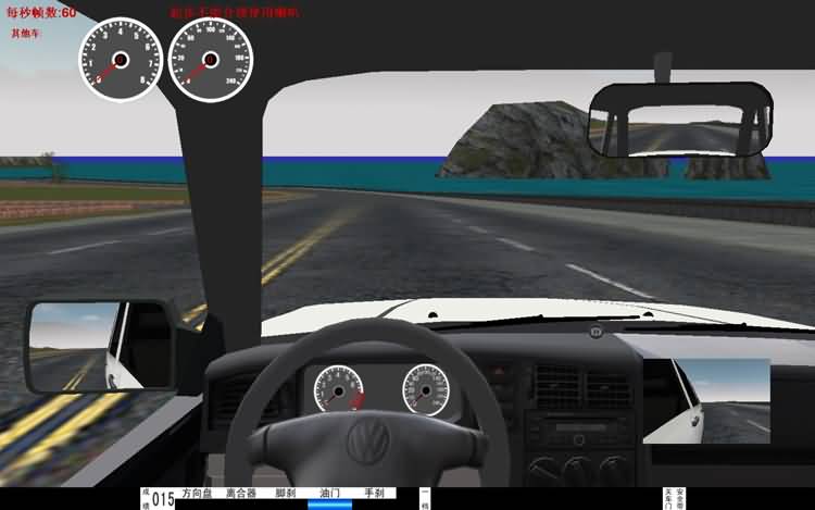 ※界面儀表盤上顯示有:車速表、發(fā)動(dòng)機(jī)轉(zhuǎn)速表、大燈、(遠(yuǎn)光燈、近光燈、視寬燈)、轉(zhuǎn)向燈、安全帶提示燈、車門關(guān)閉提示燈、警告燈及機(jī)油電瓶燈等,與硬件配合,錯(cuò)誤操作進(jìn)行扣分并具有語音提示。