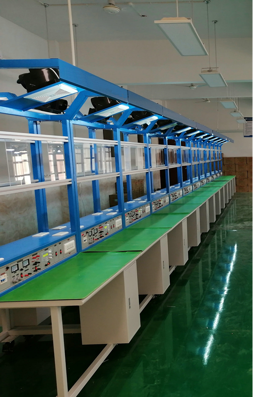 實訓桌規(guī)格為1600(長)*750(寬)*1350(高),設(shè)有二個抽屜;實驗桌主體結(jié)構(gòu)全部采用高性能表面氧化的鋁型材及一次成型鋁壓鑄框架連接構(gòu)件,連接構(gòu)件采用壓鑄成型工藝(非焊接工藝),經(jīng)機加工、拋丸、噴砂,表面靜電噴涂工藝,安裝方便、快捷,用戶可自行DIY組裝。桌體立柱采用工業(yè)鋁型材成型工藝,表面氧化處理,截面尺寸:90mm×90mm,四面帶槽,槽寬約8mm,端部裝有注塑成型配套塑料堵頭。桌面采用25mm三聚氰胺飾面板,配有一塊防靜電絕緣皮。貼桌面板下設(shè)支撐框架,承受力不少于200kg。實訓裝置整體簡約不簡單,高端大氣,符合現(xiàn)代化產(chǎn)品審美和發(fā)展趨勢。