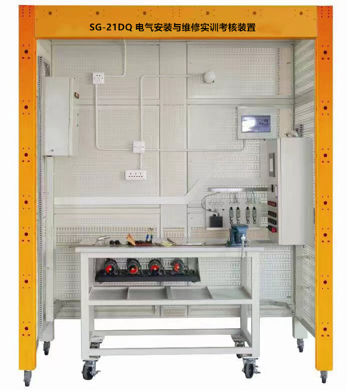 電氣安裝與維修實(shí)訓(xùn)考核裝置,可進(jìn)行電工安裝。如橋架安裝、PVC管安裝、白熾燈座、日光燈、開(kāi)關(guān)、插座、配電箱、控制箱等,裝置還包含有交流異步電動(dòng)機(jī)、直流電動(dòng)機(jī)、步進(jìn)電機(jī)、伺服電機(jī)、PLC、變頻器觸摸屏等控制與受控對(duì)象。該系統(tǒng)每個(gè)操作組配套一可移動(dòng)式工具車(chē)和元件柜,便于對(duì)元件的保管和安裝施工。從根本上解決了學(xué)校在普通墻面上進(jìn)行的安裝培訓(xùn)的使用不方便、實(shí)訓(xùn)范圍窄的問(wèn)題。