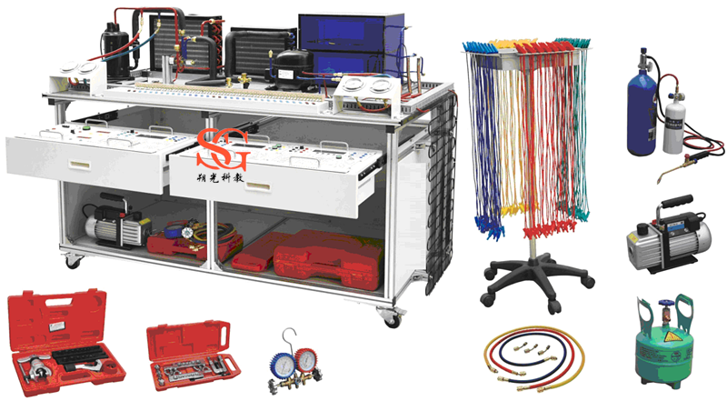 鋁合金實(shí)訓(xùn)臺(tái),空調(diào)制冷系統(tǒng)管路 1 套、直冷 電冰箱制冷系統(tǒng)管路 1 套、安全插端子排,壓 力表(1.8MPa)2 只(3.8 MPa)2 只等 |