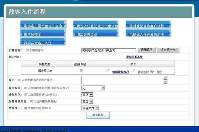 3. 填加完新的業(yè)務(wù)類型后,即可以對業(yè)務(wù)類型進行編輯,點擊某業(yè)務(wù)類型后,點擊下方的“添加步驟”按鈕,進入業(yè)務(wù)類型步驟添加界面,此時,可以輸入相關(guān)的步驟名稱,外掛模塊編號、操作角色、操作場景、部門角色等內(nèi)容,自定義某個步驟的操作方式。如下圖所示:
