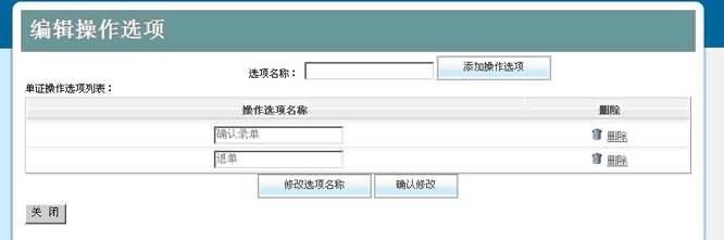 8. 選擇完單據(jù)類型后,系統(tǒng)需要為每個單據(jù)類型指定操作選項,點擊“編輯操作選項”,即可以為此單據(jù)類型增加新的操作選項,此操作選項可以在今后的實驗中,自動配置到相關(guān)的操作單據(jù)中。如下圖所示: