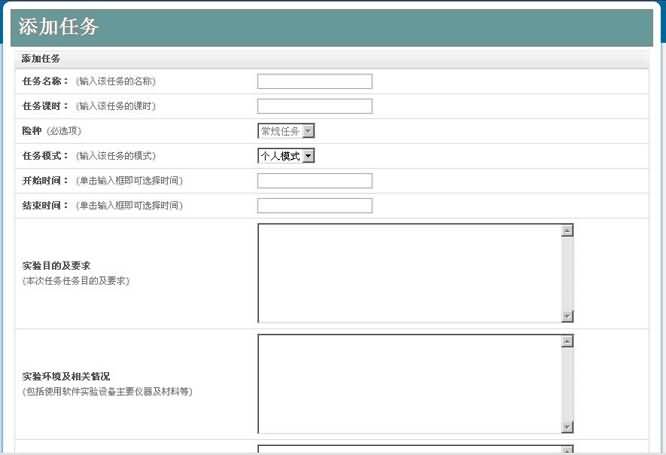2. 在輸入任務(wù)名稱、任務(wù)模式(系統(tǒng)中任務(wù)模式分為兩種:分別是個人模式和互動模式,兩者的區(qū)別在于,個人模式中,單個學生可以同時扮演多個一個實驗中的所有角色進行操作,即自己與自己進行操作,而互動模式是,在一個實驗中,一個學生之可以扮演此實驗中的一個角色,由幾個學生共同組成一個實驗小組進行實驗。)、開始結(jié)束時間、任務(wù)描述后,即完成了任務(wù)添加。如需要修改,可以在任務(wù)管理中選中此任務(wù)后點“編輯”按鈕,進行修改。