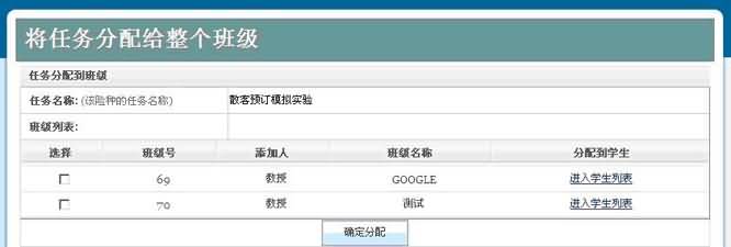2、在分配任務(wù)時,如需要給整個班級分配任務(wù),則只需在此班級前打勾,然后點擊下方“分配任務(wù)”按鈕,稍等片刻后即可分配成功;如需要給某個或者幾個學生單獨分配任務(wù)時,則可以點擊此實驗右側(cè)“進入學生列表”按鈕,選擇需要分配的學生后,點擊“分配任務(wù)”即可,如下圖所示: