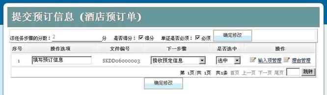 11. 完成上述操作后,可選擇某個步驟后,點擊“操作選項”按鈕,進入單證實驗考核點及考核點正確答案、評分的配置。在此步驟中,首先需要配置操作選項的正確項,在正確項的操作選項后選擇“選中”按鈕。并選擇此單證需要流轉(zhuǎn)的下一步操作,如有需要,可以為此操作設(shè)置是否得分。完成后點擊“確定修改”按鈕,完成流程考核設(shè)置。如下圖所示: