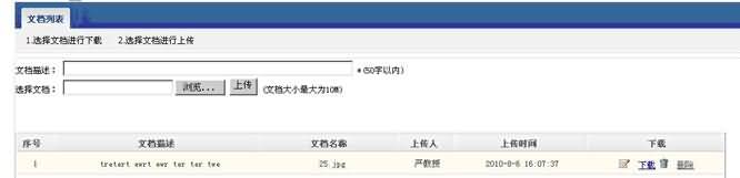 點擊“文檔上傳”,進入文檔上傳界面,在文檔描述中輸入此文檔的相關(guān)描述,然后在下方選擇此文檔本地文件路徑,點擊右側(cè)“上傳”按鈕,完成上傳。如下圖所示: