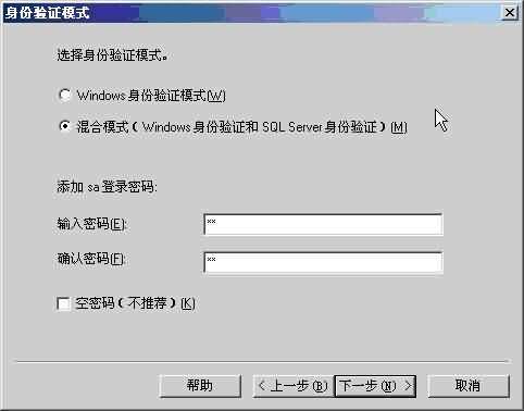 安裝SQL.Server.2000按照提示進行,在選擇身份驗證模式的時候,請選擇混合模式,其他不需做任何改變。