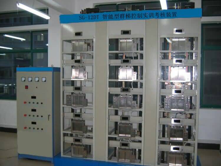 本設(shè)備采用交流變頻調(diào)速器與PLC通過開關(guān)量或數(shù)字量兩種模式進行控制,并且設(shè)置了常見的幾十項電路故障供學(xué)生實操。整套設(shè)備采用三臺五層群控電梯,每部電梯都由一臺PLC控制,PLC之間通過RS-485串行通訊卡交換數(shù)據(jù),電梯外呼統(tǒng)一管理,接近現(xiàn)實中的樓宇電梯控制。通過它,學(xué)生不但可以提高故障的檢測和排除能力,還可以了解多臺PLC聯(lián)機編程原理從而提高編程技能。