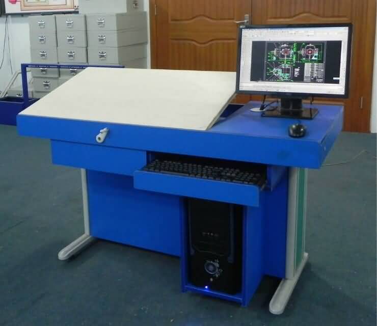 工程繪圖桌是根據(jù)制圖課學(xué)習(xí)的要求設(shè)計(jì)的,符合人體工程學(xué),設(shè)計(jì)新穎,穩(wěn)定可靠,功能齊全。板面斜度具有0-40度范圍可調(diào), 轉(zhuǎn)動(dòng)手柄即可調(diào)節(jié)面板傾角,傳動(dòng)部分為中碳鋼和鋁合金材質(zhì)的螺旋傳動(dòng),堅(jiān)固耐用。臺(tái)面下的抽屜可放文具、資料等。右邊可放置電腦,是一款具有手工畫圖和電腦做圖的一體化工程制圖桌。是各大院校的理想首選制圖實(shí)驗(yàn)室設(shè)備。
